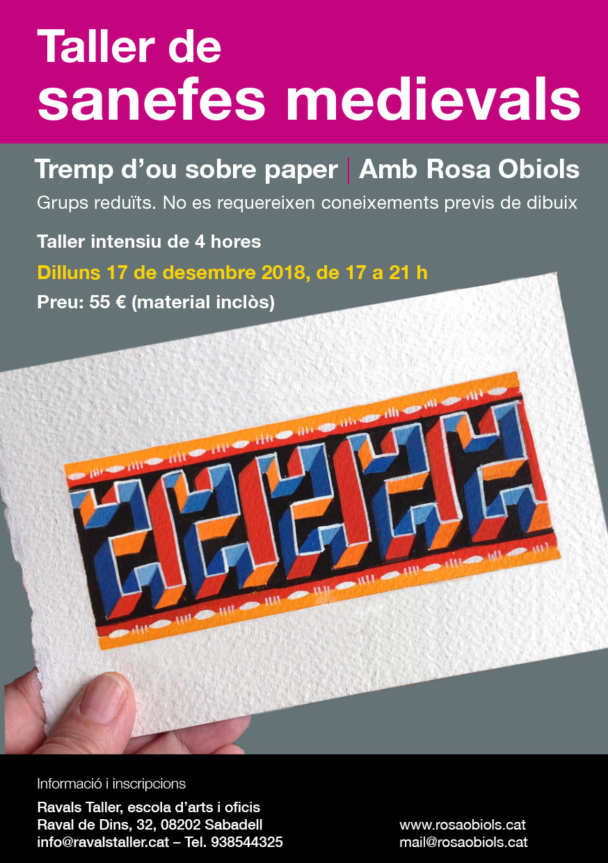 Taller pràctic de realització de sanefes romàniques sobre paper. Amb la tècnica de pintura al tremp d’ou com a base. Experimentaràs amb la preparació de la pintura, a base d’una emulsió de pigments naturals, ou, aigua i vinagre. Podràs escollir entre diferents models de sanefes d’inspiració romànica o gòtica i podràs fer una, dues o més …